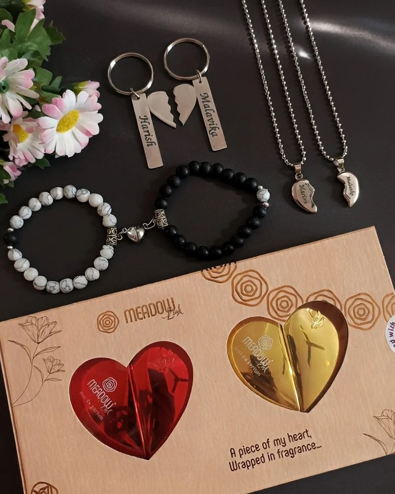 Celebrate a bond that’s as unique as your story with the Personalized Eternal Love Couple Combo from a2zeegifts. This set is more than just a gift; it’s a collection of shared emotions and memories designed to bring you closer. From the intimate scent of the “Meadow Lush” couple perfumes to the magnetic attraction of matching bracelets, every detail is a reminder that you are two halves of one heart. Perfect for Valentine’s Day, anniversaries, or making any ordinary day extraordinary.