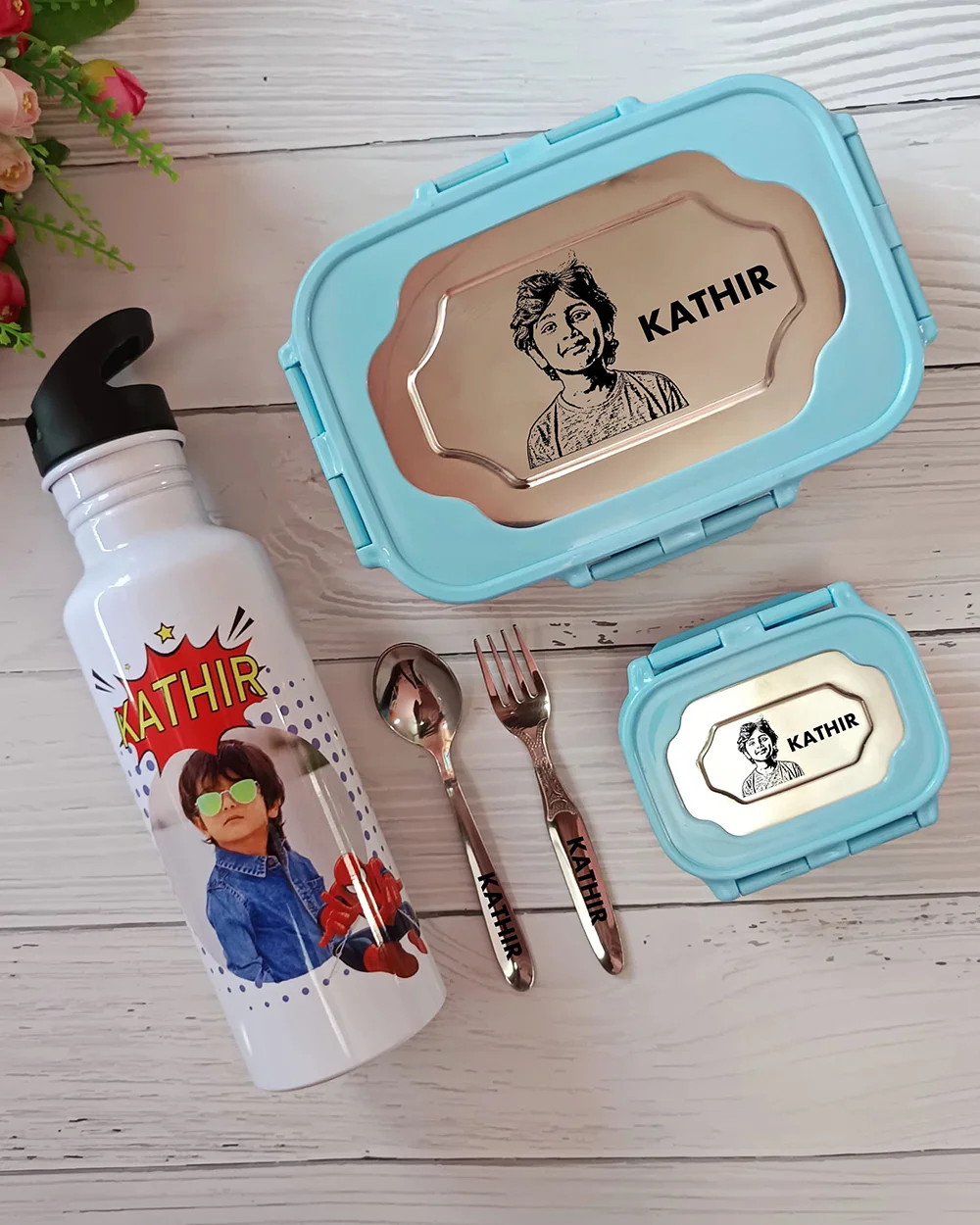 🍱 Customizable – Name & photo on tiffin and bottle, name on spoon, and fork